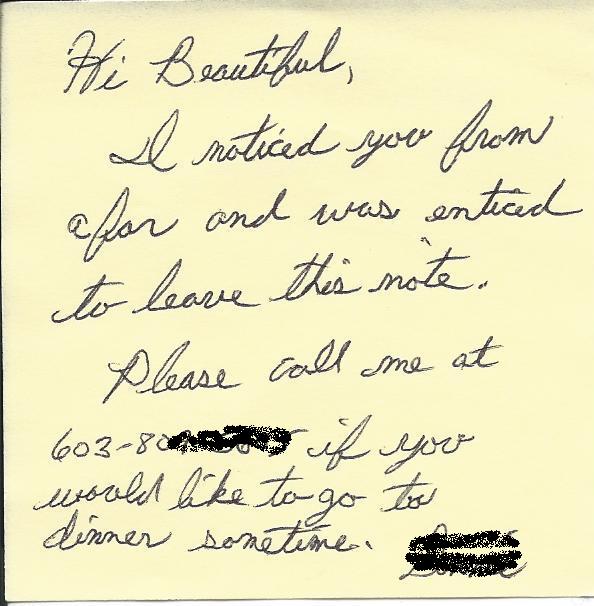 Actually, I thought about it some more, and the idea of a guy noticing a girl, figuring out which car she drives, and leaving a note on her car is UBER CREEPY! That’s basically in the category of stalking and desperation, and it’s a sign of a low self-esteem. The use of cursive writing is also a bit effeminate and that writing style looks like someone who was struggling to write that way. So, either he’s trying to disguise his handwriting or he rides the short bus….probably both.