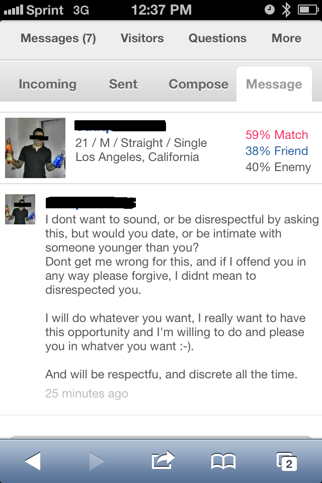 The reason why I would use something like this on my blog, is to show how desperate and clueless people have become. The line, “would you date, or be intimate with someone younger than you” is pathetic and hysterical (hysterically pathetic?) all at the same time. Cali and I had a good laugh over his desperation and audacity because we couldn’t think of where in the world he got the idea that this kind of approach would work on anyone? There is no woman out there that would fall for this kind of approach. Especially someone as attractive as Cali, because not only does this comes across desperate, but it’s also creepy.
